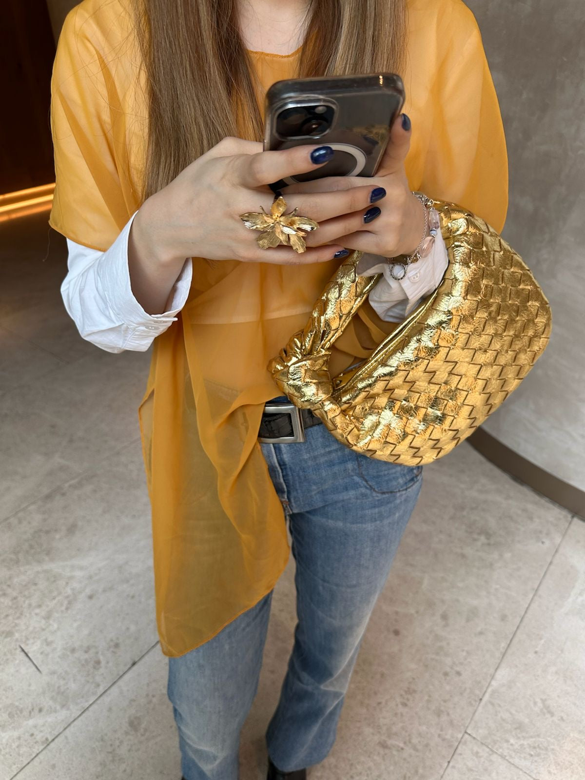 Inspirada en el diseño minimalista contemporáneo, esta bolsa se convierte en un accesorio imprescindible para quienes buscan sofisticación en cada detalle. Su acabado en cuero sintético trenzado y su delicado asa superior anudada le otorgan un estilo distinguido y versátil.